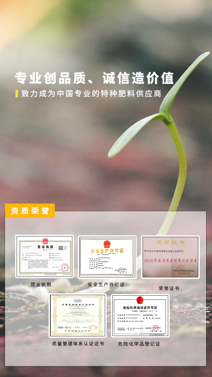 經(jīng)過二十余年的探索和實踐,依托自身技術和出口背景,按照國際市場規(guī)范培養(yǎng)了大批高素質的專業(yè)化技術化團隊,掌握了水溶性肥料的核心技術,擁有完善的研發(fā)中心、質檢中心,目前已獲得多個國家專利技術。公司一直把“做中國專業(yè)的特種肥料供應商”作為自身的發(fā)展使命。推廣高端植物營養(yǎng)與先進技術,高效施肥方式的綜合配套方案,減輕中國種植業(yè)勞動強度,讓種植業(yè)效率更高、效果更強、效益更好!努力成為革新中國種植業(yè)生產(chǎn)方式的偉大公司!